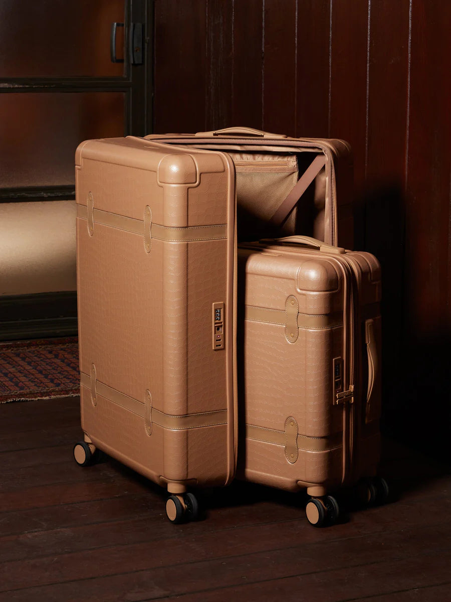 • Elevate your travel style with our modern take on vintage trunk luggage.