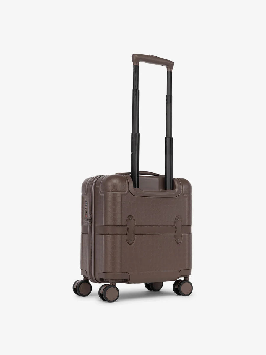 Introducing the mini luggage version of the vintage-inspired TRNK style you love. This mini carry on luggage features a luxurious faux-crocodile design on an ultra-durable hard-shell exterior. Small enough to fit in the overhead bin, and large enough to store all your essentials for a quick, whirlwind city break. Pick a timeless colorway, and pack this small carry on for your most stylish adventure ever.