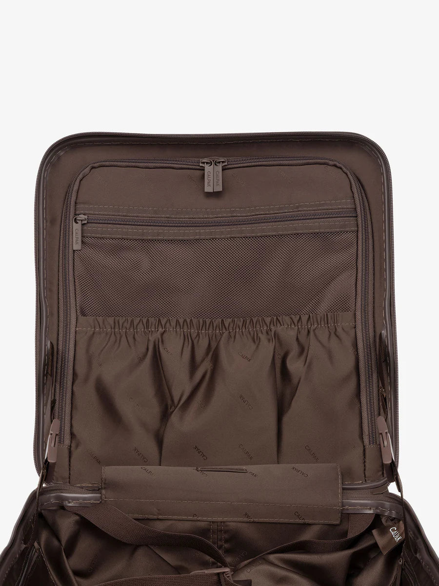 • Interior buckled elastic strap and divider with multiple pockets